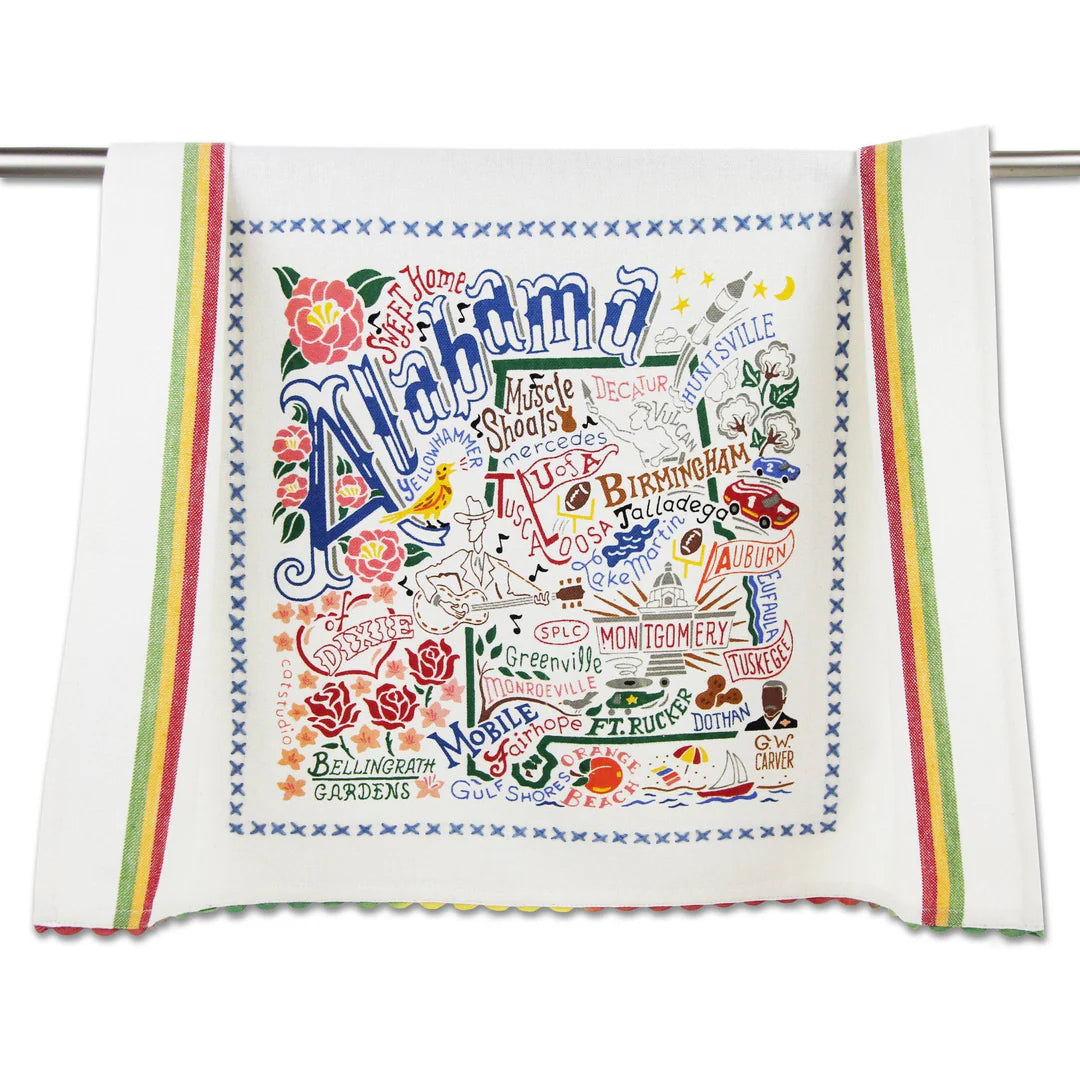 Our original design is printed using the labor intensive hand-swipe silk-screen process with 12 colors (that's 12 screens used for each towel!). The design is framed with a hand-embroidered border on a 100% hand-loomed cotton towel generously sized at 20x29 inches. Three cheery woven stripes run down both sides and hand-dyed rick-rack at the top and bottom add a charming vintage touch. All this delightfully presented in a fab organdy re-usable pouch ready for gifting!