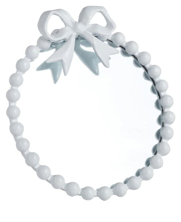 Add a dash of sophistication to your décor with this exquisite mini mirror. The elegantly contoured frame showcases a gleaming metal bauble and delicate layered bow-and-ribbon accents that exude refined taste. Its practical easel back ensures stable positioning on any surface, while sawtooth hardware provides wall-hanging options for maximum display flexibility. Whether adorning a vanity, shelf, or desk, this charming piece instantly elevates your space with timeless style and decorative appeal.
