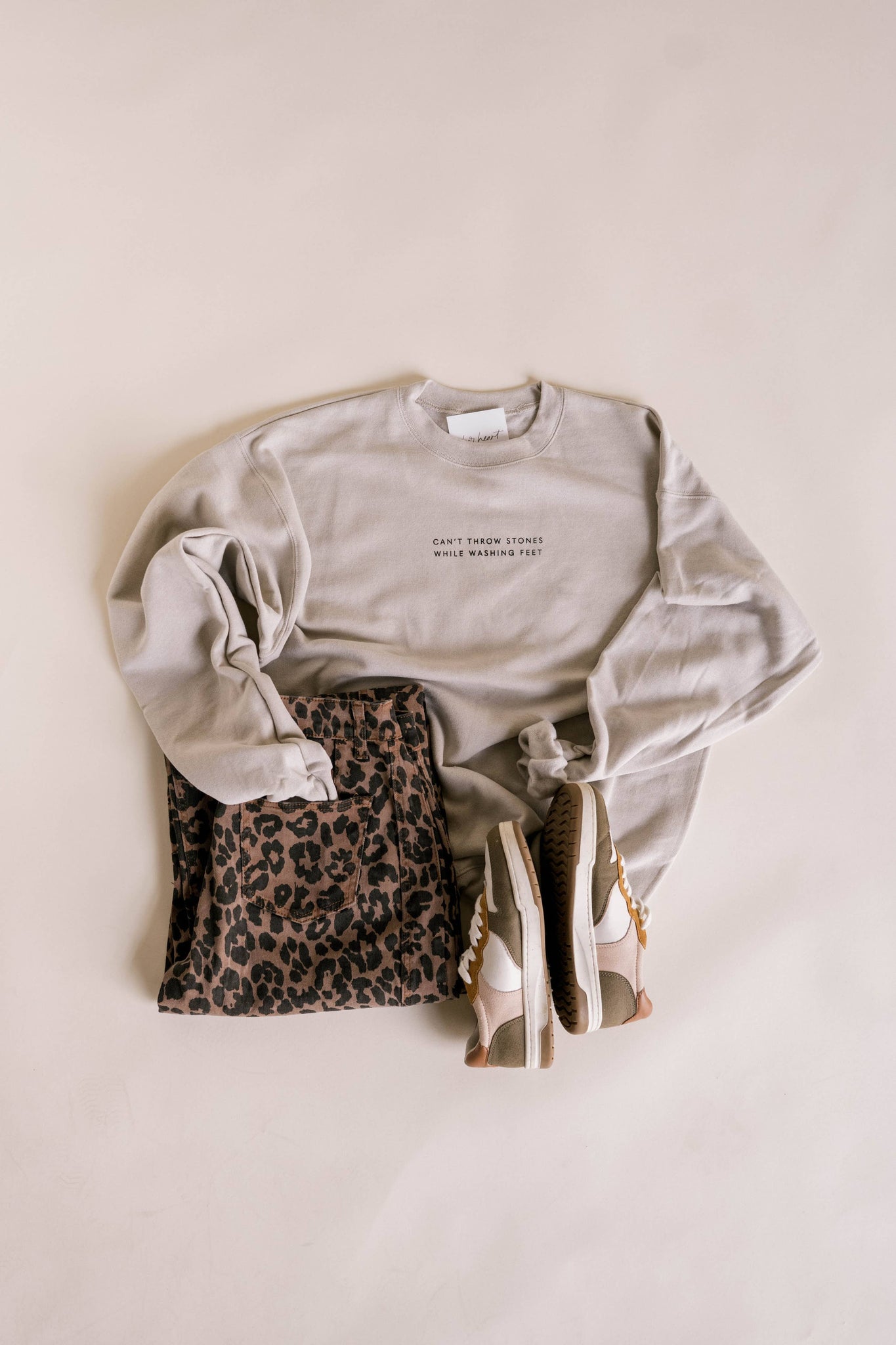 “He who is without sin among you, let him throw a stone at her first.” John 8:7 This pullover is inspired by a story found in John chapter 8 in the Bible. The scribes and Pharisees were telling Jesus about a woman caught in adultery and Jesus replied to them saying that whoever was without sin could throw a stone at her first. In other words, only whoever was sinless had the right to judge her. We have all fallen short. None of us are sinless. Jesus is the only one who has the right to throw stones, yet He doesn’t...He serves. He meets people where they are. He loves them through their mess. He looks past their faults and sees His child. His kindness leads to repentance. We are called to serve like He does. We are called to live like He does. We are called to extend compassion, kindness, and love. It doesn’t mean sin is excused, it means judgement isn’t ours but God’s. Are you a stone thrower or a foot washer? Can’t throw stones while washing feet. Sandstone Pullover with Black Ink