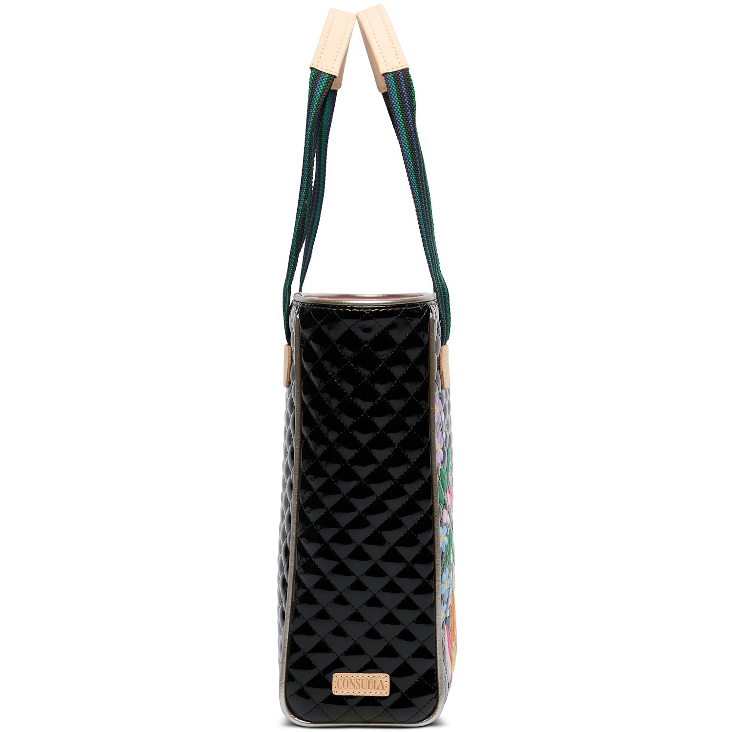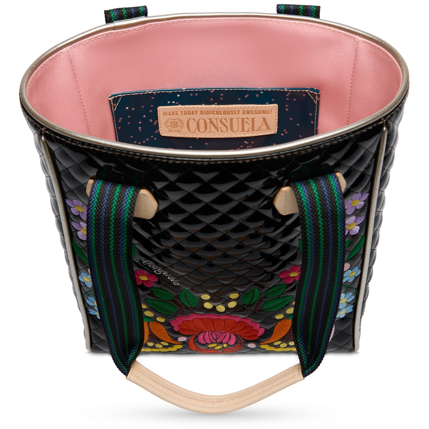 - Iconic floral embroidery on black quilted exterior