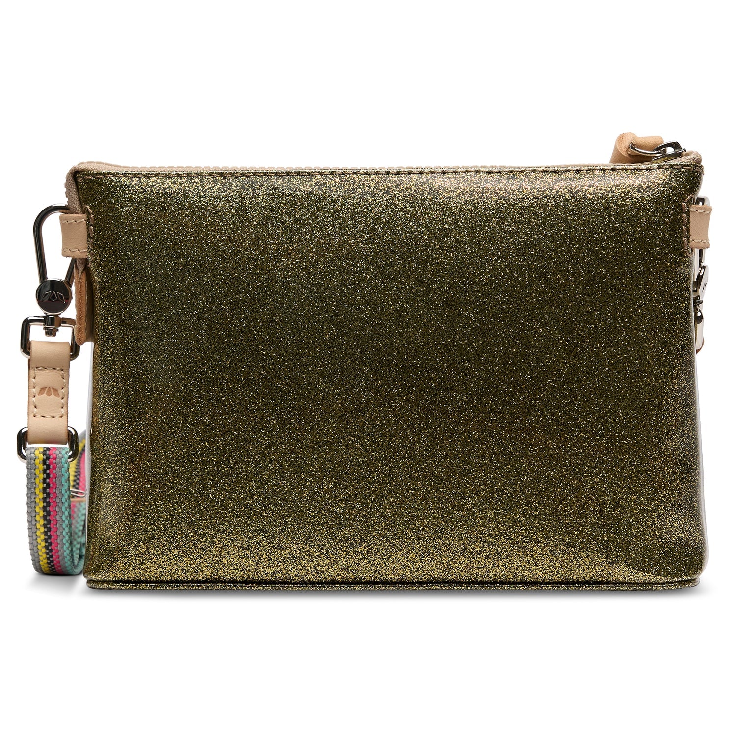 - Includes detachable and adjustable woven crossbody strap