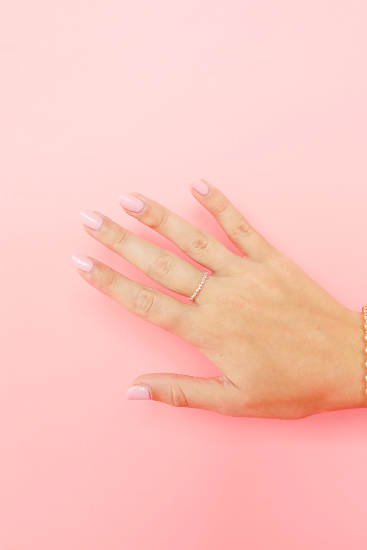 Our dainty silver Beaded Bands™ are an elastic ring perfect to wear alone or to be stacked with your class ring or other statement rings.