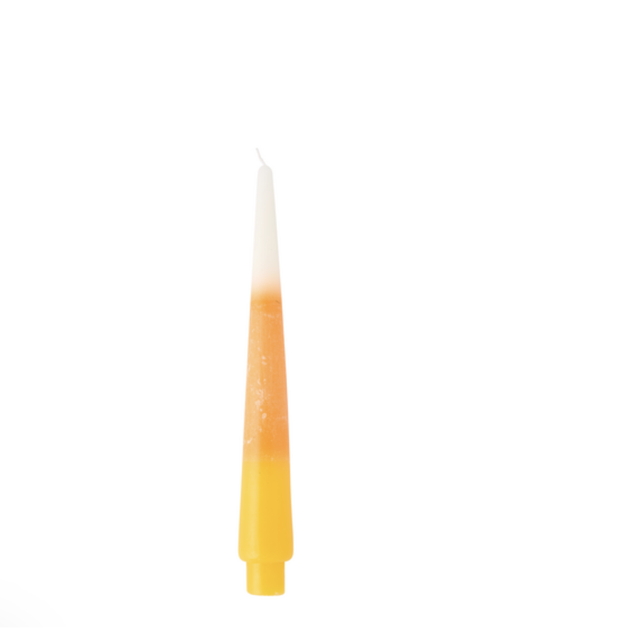 Wax figural taper candle. Light up your Halloween celebrations with the Candy Corn Halloween Taper Candle. This charming candle is designed to resemble the classic candy corn treat, bringing a playful and festive touch to your seasonal decor. Perfect for adding a warm, flickering glow to your Halloween parties or cozy autumn nights, this taper candle blends fun and tradition. Whether used as a centerpiece, on a mantel, or in a decorative arrangement, the Candy Corn Halloween Taper Candle is sure to enhance the spooky ambiance of your home.