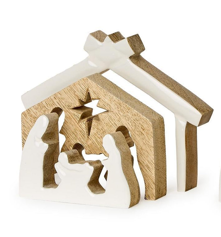 Celebrate the true meaning of the season with this beautifully hand-crafted set, featuring a minimalist yet elegant depiction of a cherished holiday scene. Made from natural mango wood with a smooth enamel finish, each piece is designed with three individual parts to create depth and dimension. Perfect for mantels, shelves, or as a heartfelt gift, this set blends rustic charm with timeless tradition.