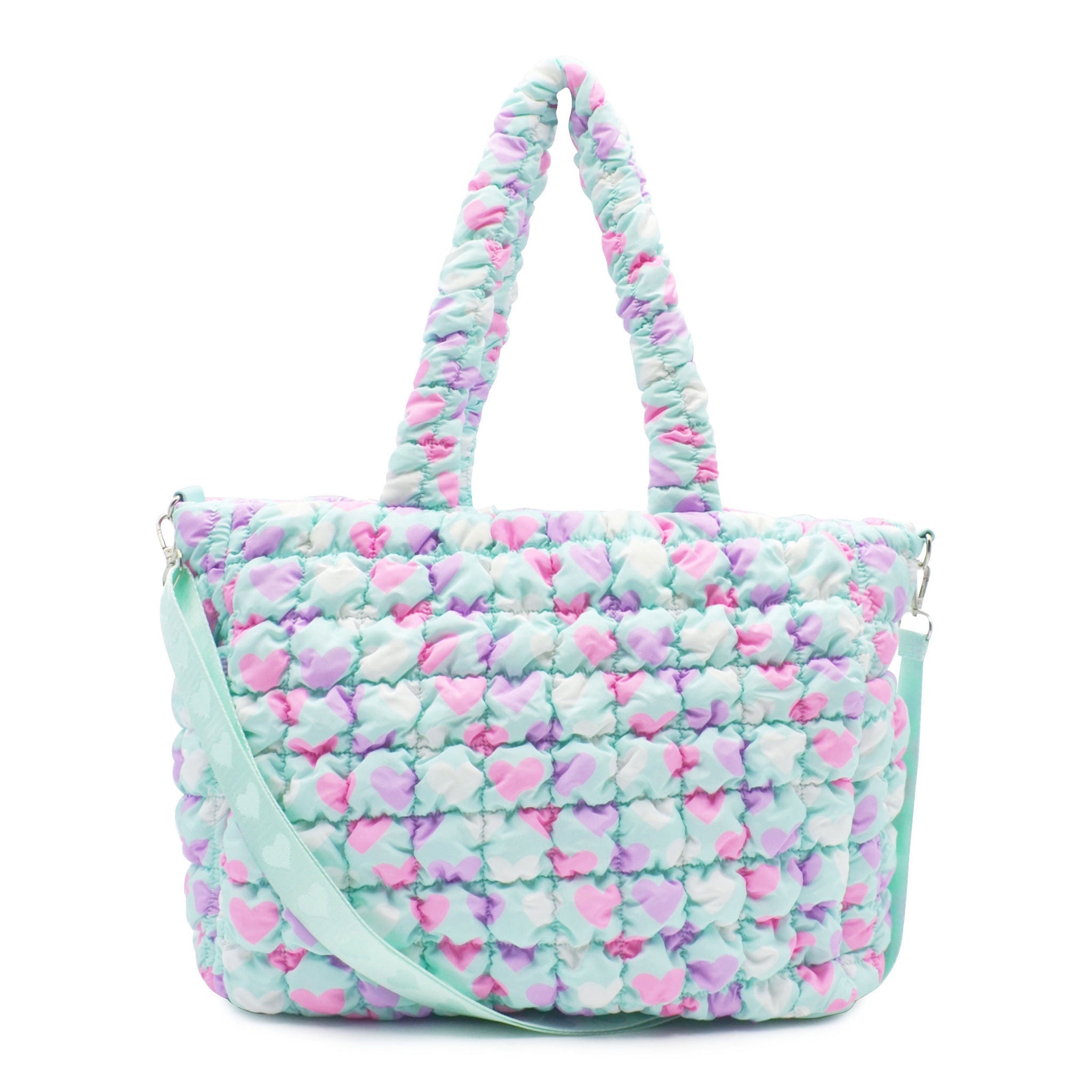 Where style meets versatility! From their extra curriculars, to the gym, dance class and everywhere else! They'll be carrying it all in our newest must have trendy nylon quilted pastel heart-printed light aqua scrunch tote bag - with two side pockets. Where it as a tote or a shoulder bag with our detachable adjustable strap!