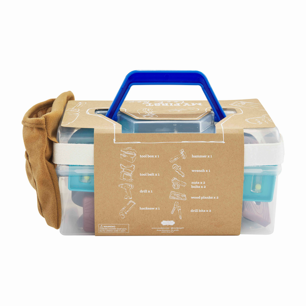 Let your little one pretend to be Daddy with our Kids First Tool Box. The 10-piece set comes with a plastic tool box. The set also comes with a wearable tool belt, screwdriver, hammer, drill + bits with noise, level, hacksaw, wood planks, wrench and working nuts and bolts. This set is intended for ages 3 and up.