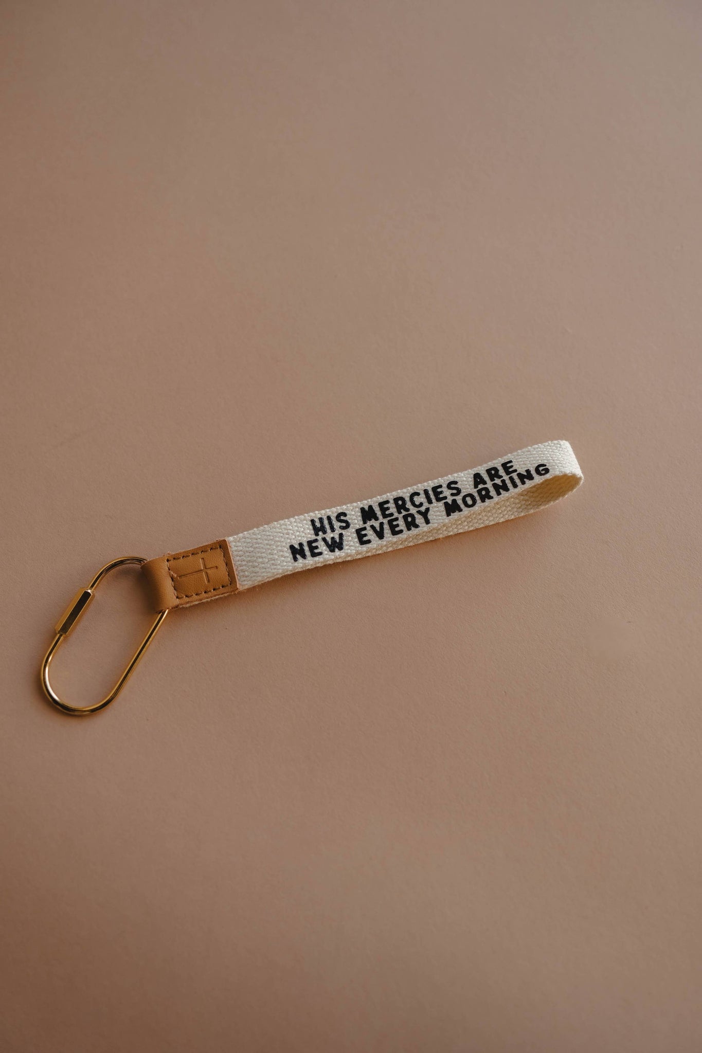 Perfect to carry all of your keys on! -Wristlet is 3/4" x 6 1/2" on woven fabric with 2" gold carabiner. -Cross symbol stamped onto 1" leather tag attached to carabiner. -"His mercies are new every morning" printed on fabric.