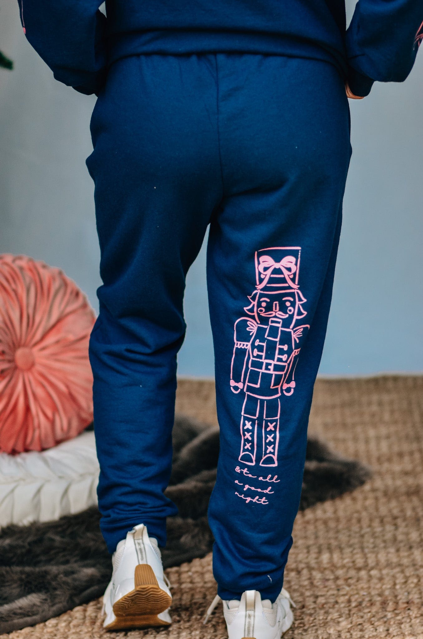 Meet your new favorite festive lounge pants. These navy joggers feature pink nutcracker illustrations and bow details that tie back to the coordinating sweatshirt. Soft, relaxed, and a little bit cheeky—pair them with the matching sweatshirt for the ultimate holiday chill set.