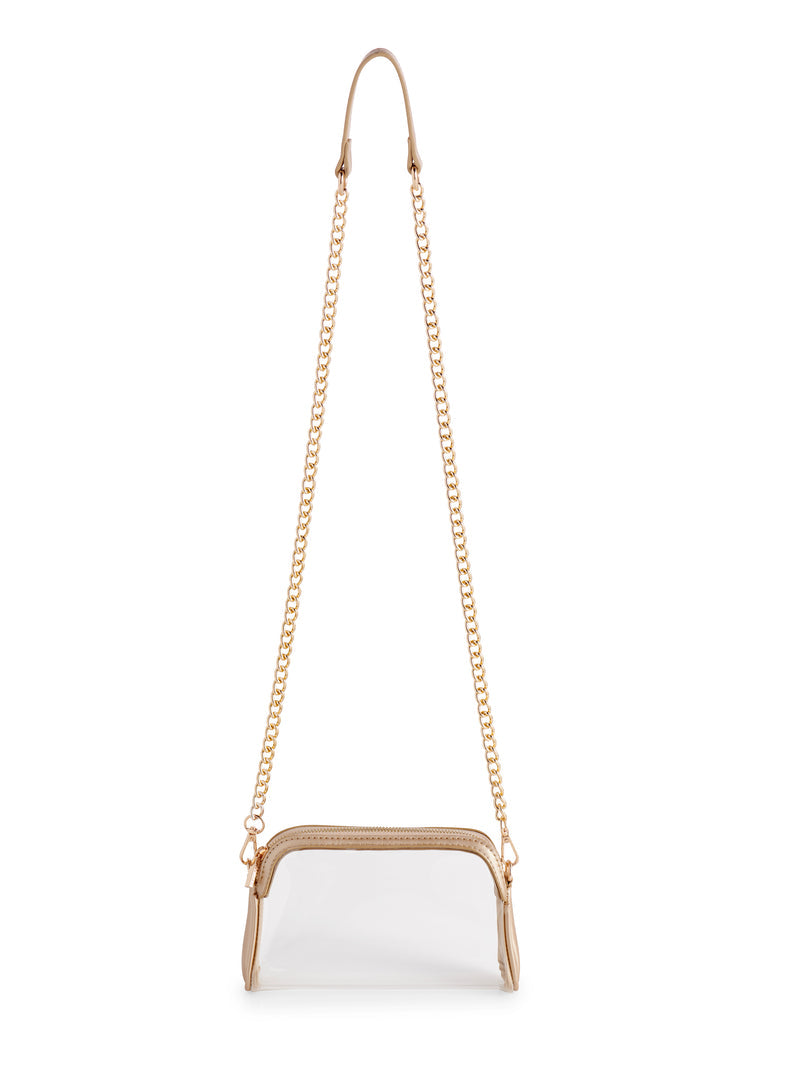 Meet the Taylor Cross-body – your go-to bag for stadium games, concerts, or any event where style and security go hand-in-hand. Made from sleek, transparent PU, this compact cutie is perfect for storing your essentials while staying event-compliant. It features a chic gold chain strap with a vegan leather shoulder detail that’s both comfy and detachable. Swap out the strap to mix and match with your favorite accessories for a personalized twist.