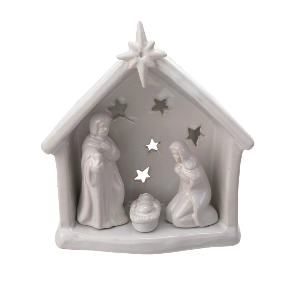 Crafted in elegant white stoneware, this piece features intricate star cut-outs that cast a warm, peaceful glow when lit. Perfect for Christmas décor or year-round inspiration, it beautifully captures the Holy Family’s spirit and makes a meaningful gift or centerpiece for your home.