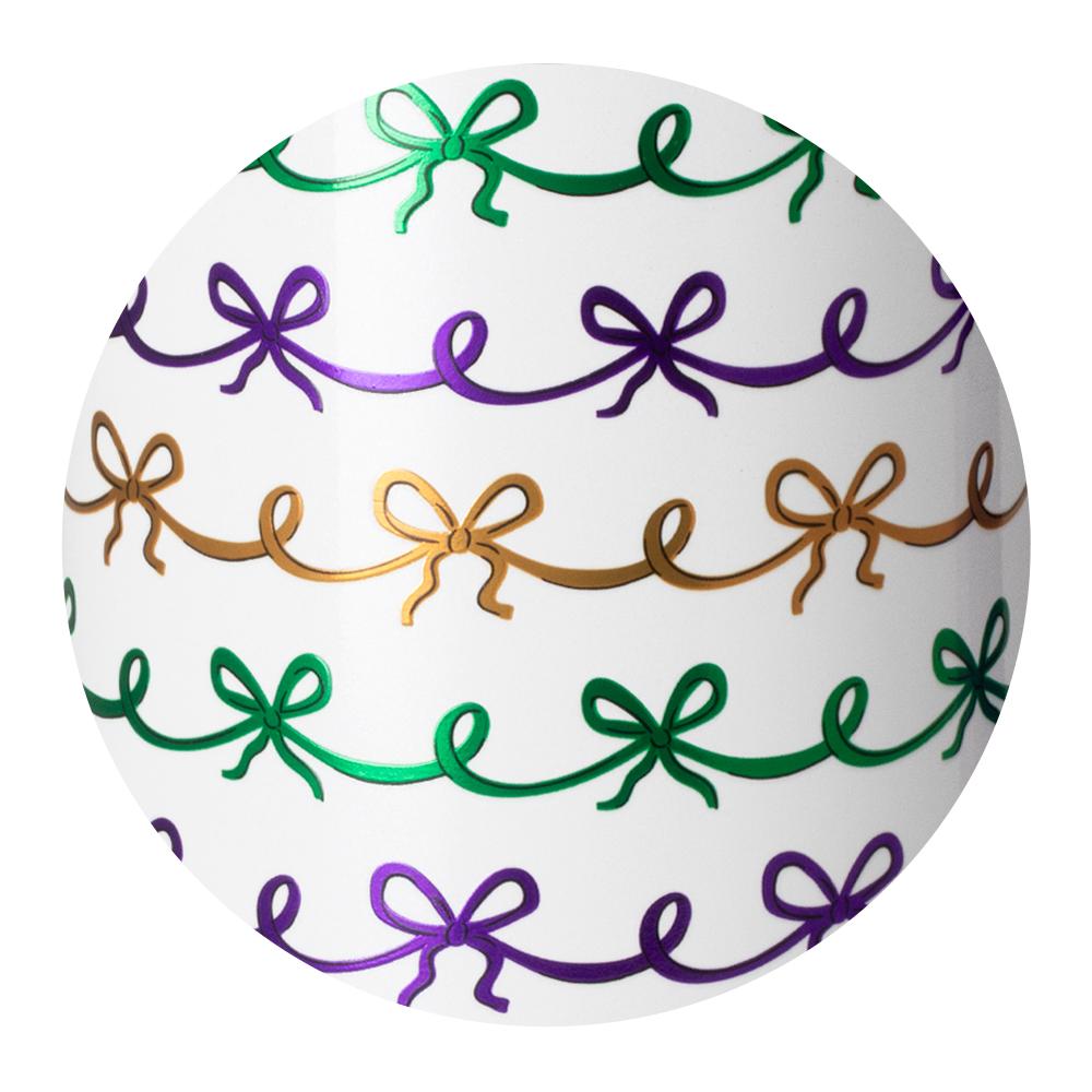 Cold sips, no sweat! 💧 Bring on the bows, beads, and bourbon with this Mardi-ready print, featuring purple, green, and gold metallic bows on a glitter white background.