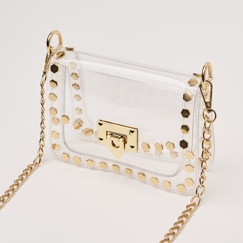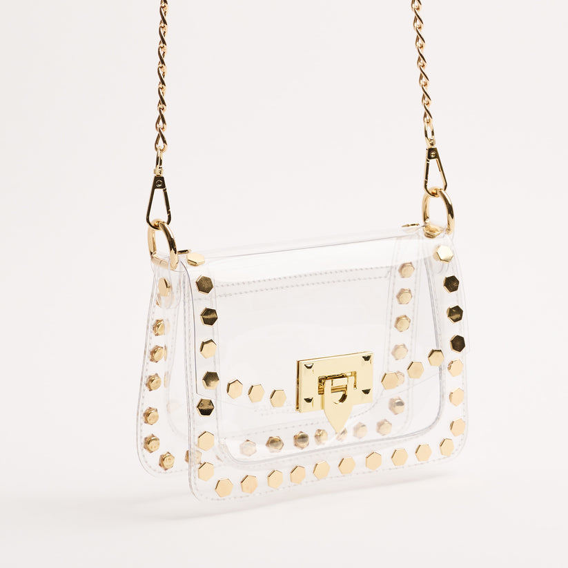 clear handbag playbook - The Jackie! The Jackie changed the handbag game by proving clear handbags could be both functional and chic. This style includes gold hexagon metal studs and a gold chain. The Jackie is NCAA and NFL compliant and the ideal size to hold your wallet, phone, keys, lip gloss and a few other small items.
