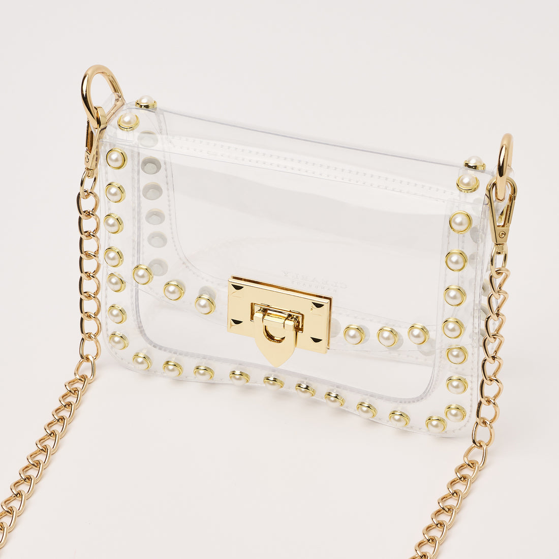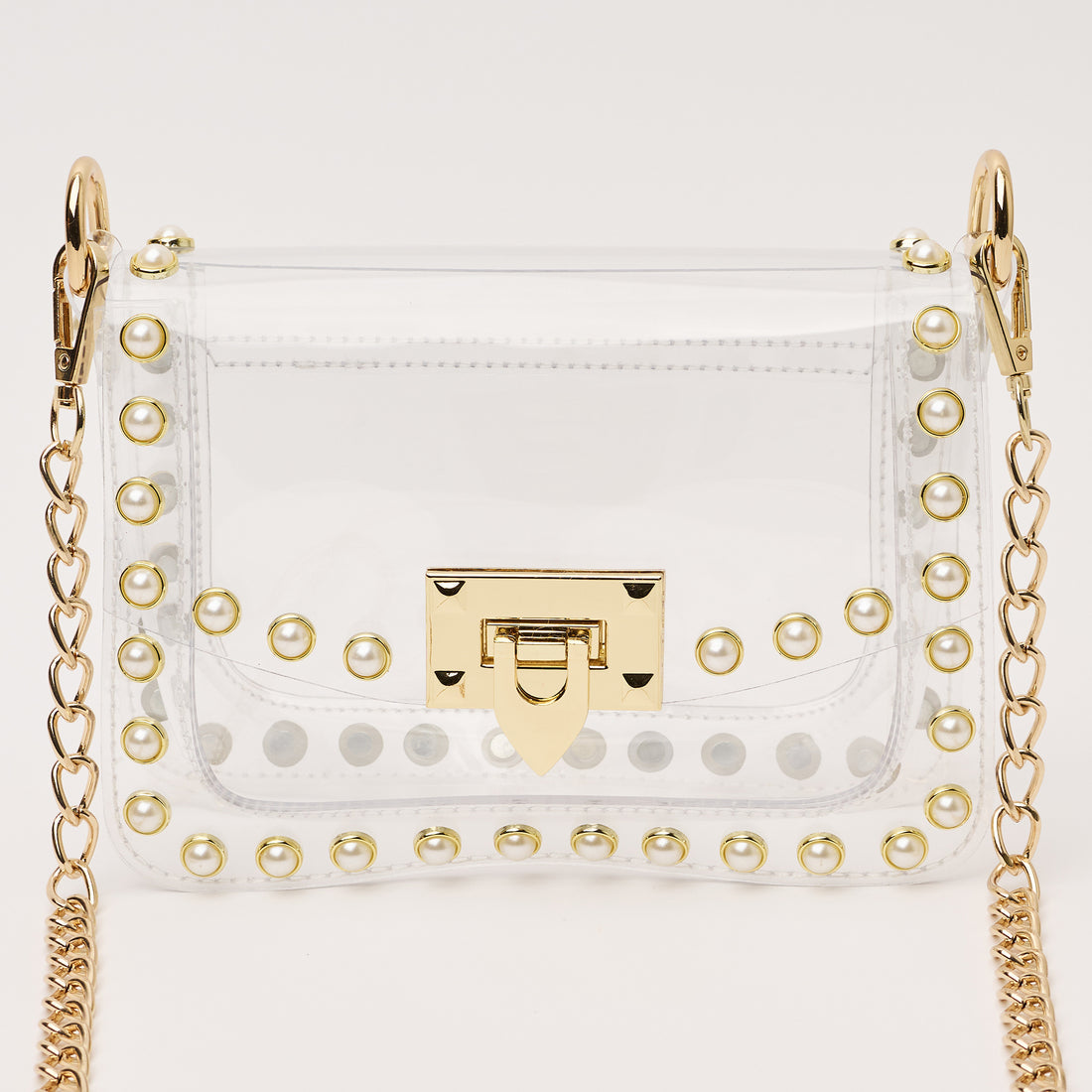 Score with the biggest winner in our clear handbag playbook - The Jackie! The Jackie changed the handbag game by proving clear handbags could be both functional and chic. This style includes pearl metal studs and a gold chain. The Jackie is NCAA and NFL compliant and the ideal size to hold your wallet, phone, keys, lip gloss and a few other small items.